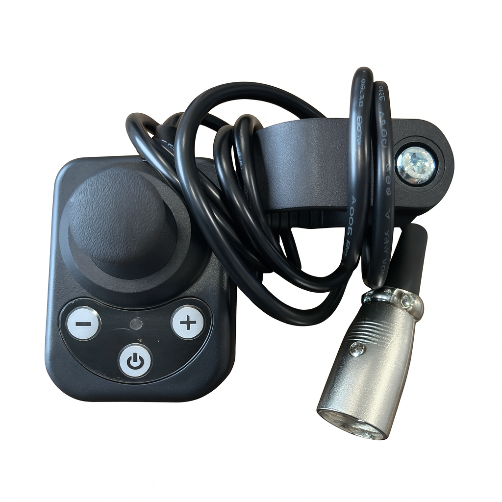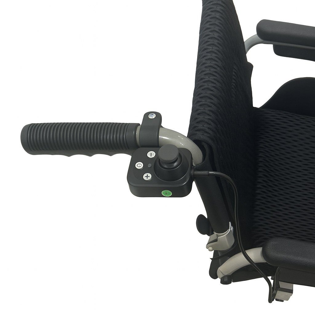 ההתקנה מהירה ופשוטה – הבקר מתחבר לידית האחורית של הכיסא עם מנגנון הידוק נוח, והכבל מתחבר ישירות למערכת השליטה. כך, גם המטופל וגם המטפל יכולים לנהוג בכיסא בכל רגע נתון, ללא צורך להחליף בקרים או להתאים הגדרות.